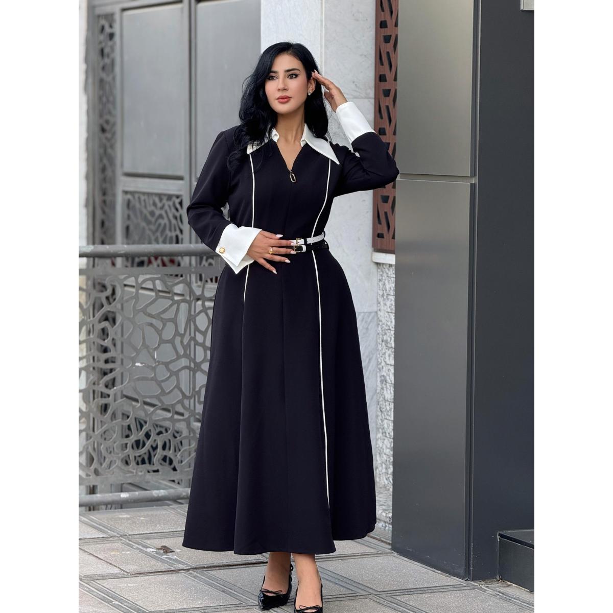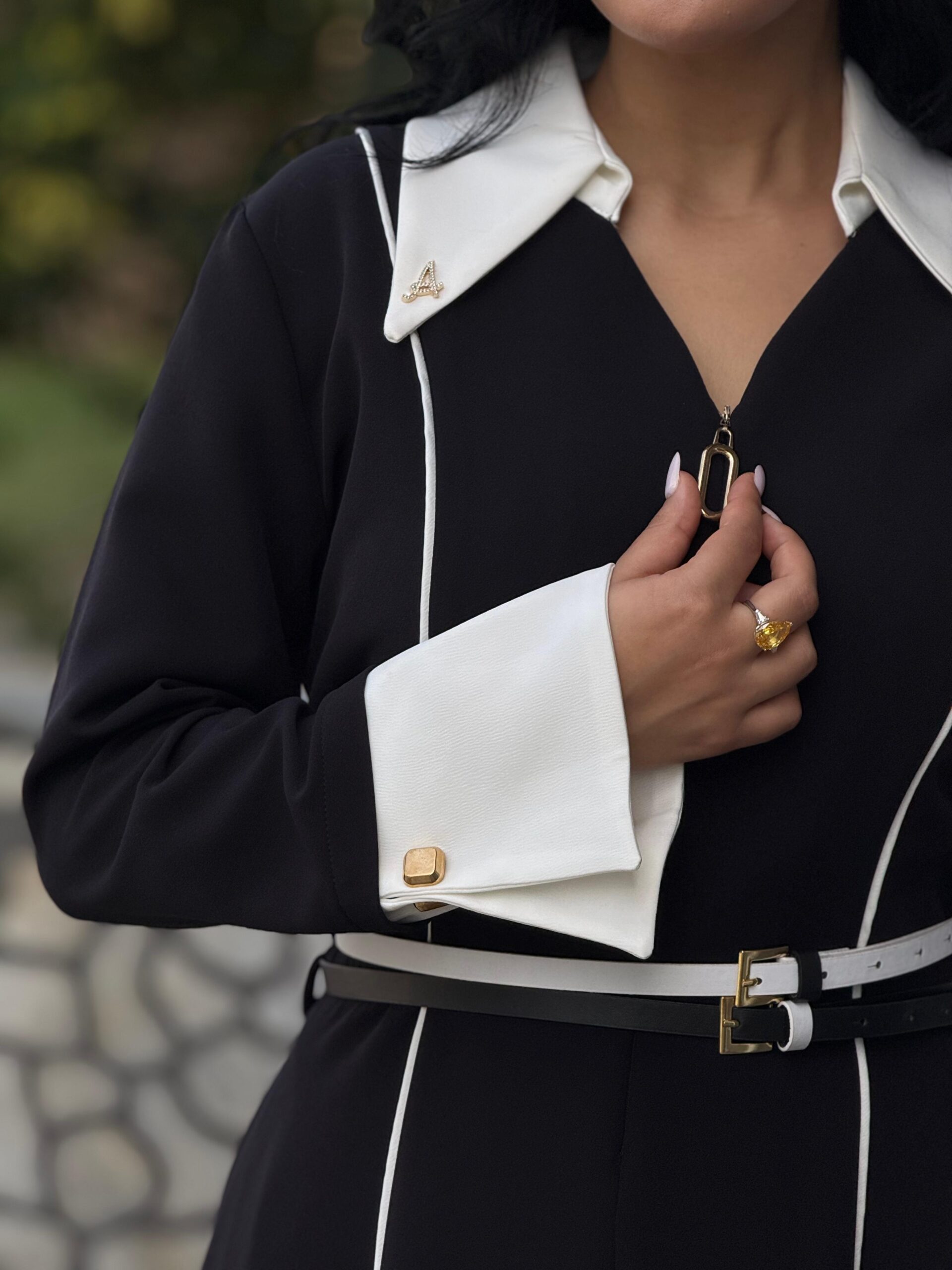 Les détails en blanc immaculé (col chemisier et poignets) contrastent superbement avec le noir profond, créant un effet visuel raffiné et professionnel. La finition passepoilée met en valeur les lignes du corps.