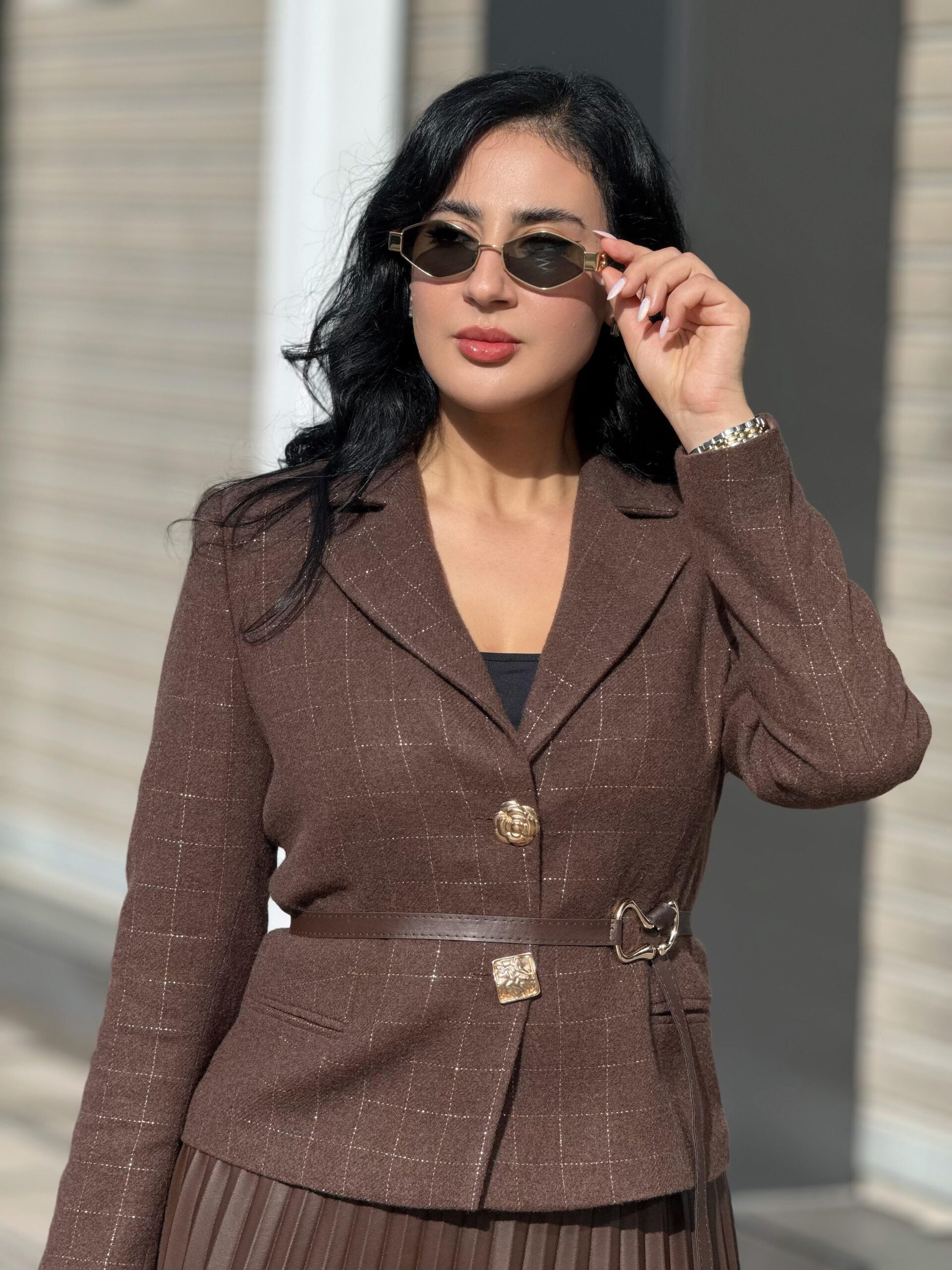 Le Blazer est une pièce structurée d’une richesse incroyable. Son tissu en laine/tweed brun présente un motif carreauté subtil et est rehaussé de touches dorées au niveau de la ceinture.