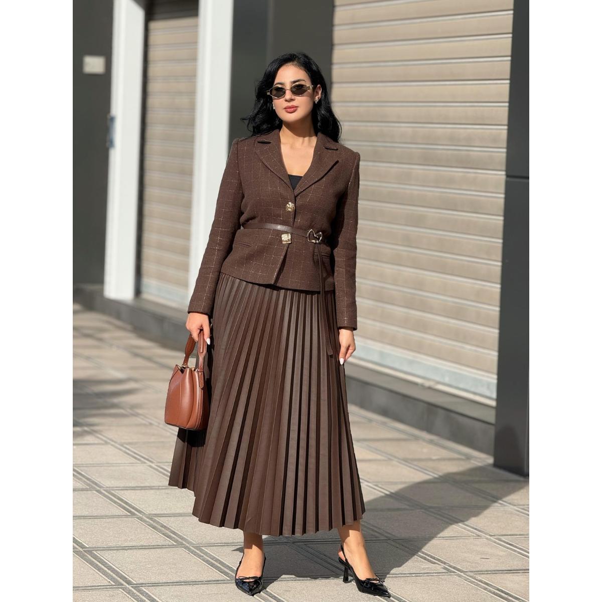 La Jupe « Pli Ambré » est la pièce phare de la saison. Sa sublime couleur brun chocolat riche et sa matière à l’effet cuir souple créent une texture luxueuse.